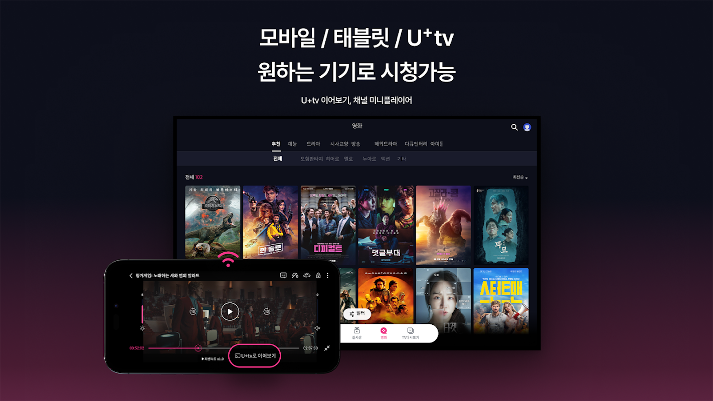 - Możesz kontynuować oglądanie tej samej sceny, którą oglądałeś na telefonie na zewnątrz lub w U+TV w domu.