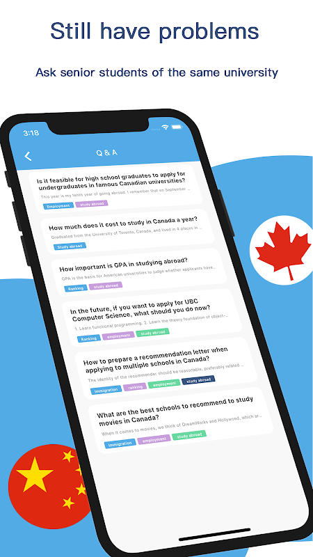 Good assistant for studying abroad in Canada, continuously updated college information, online question answering by seniors, self-test of professional interest