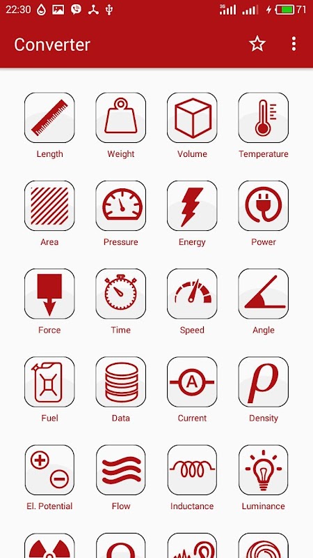 aplikacja przekształca takie jednostki, jak długość, waga, objętość, temperatura, powierzchnia, ciśnienie, energia, moc, siła, czas, prędkość, kąt, paliwo, dane, prąd, gęstość, potencjał elektryczny, przepływ, indukcyjność, luminancja, promieniowanie, oporność dźwięk itp.