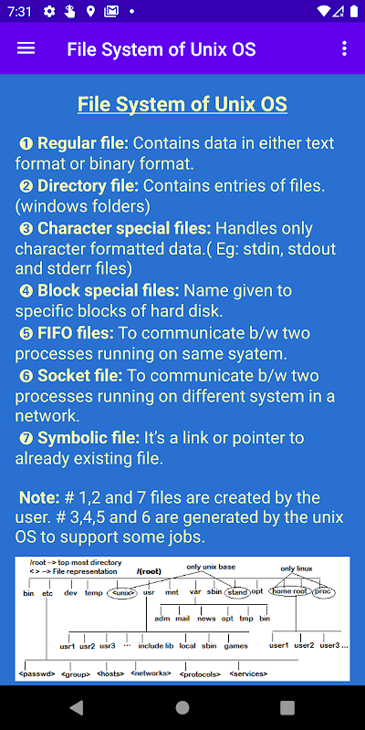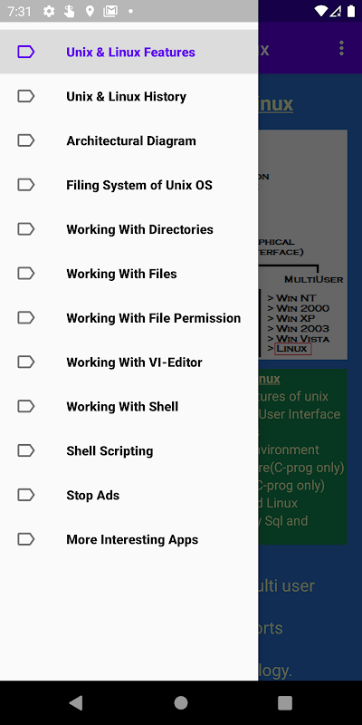 Dzięki tej aplikacji możesz łatwo nauczyć się systemów Unix i Linux. Udostępniliśmy bardzo proste i jasne informacje z najlepszymi schematami architektonicznymi i przykładami. Zapewniliśmy doskonałą nawigację do przechodzenia z jednej strony na inną w tej aplikacji dla systemów Unix i Linux. To całkowicie darmowa aplikacja.