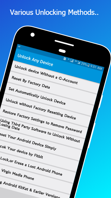 Unlock any device to protect and secure data. Everyone needs to secure data or preventing unauthorized use of his data in this modern era. One method to protect your phone data is to lock your phone screen by pattern, pin or in other way like face recognition. This app provide guide to solution of problems of device locking or unlocking. Easy Unlocking Guides Process Explained.