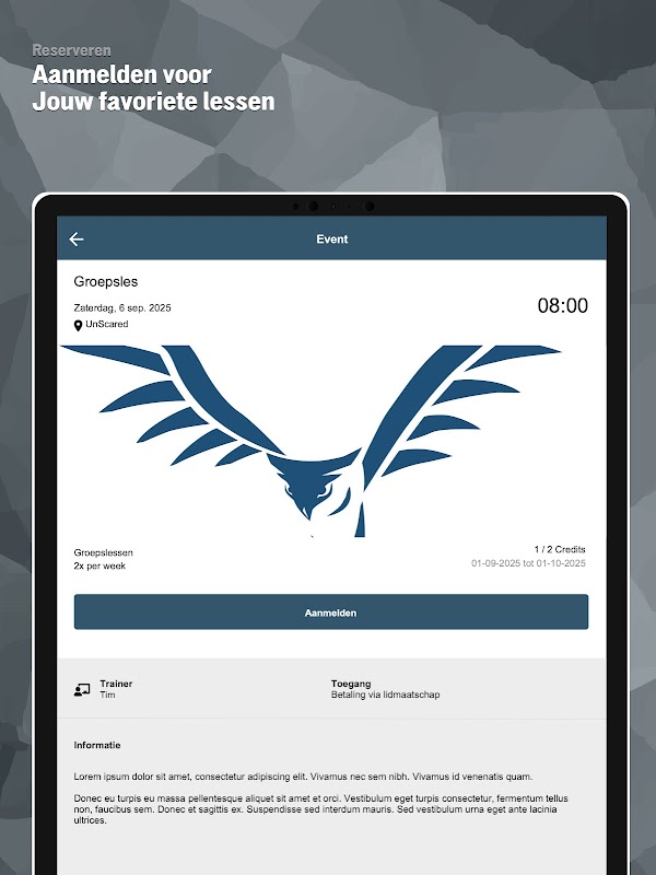 Schrijf je in voor jouw Unscared Lessen, houd je trainingprogressies bij en volg je trainingbuddies. Bestel traininggear en voedingsupplementen binnen enkele secaonden!