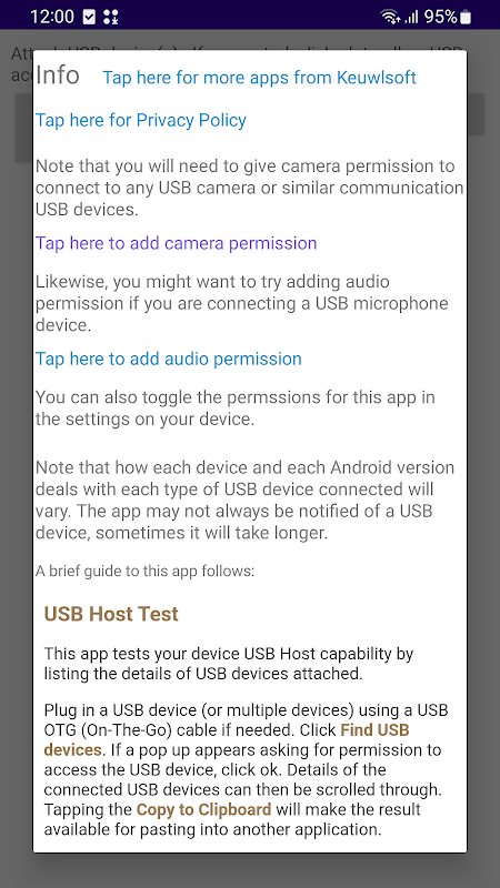 Sprawdza możliwości hosta USB urządzenia, wyświetlając listę podłączonych urządzeń USB.