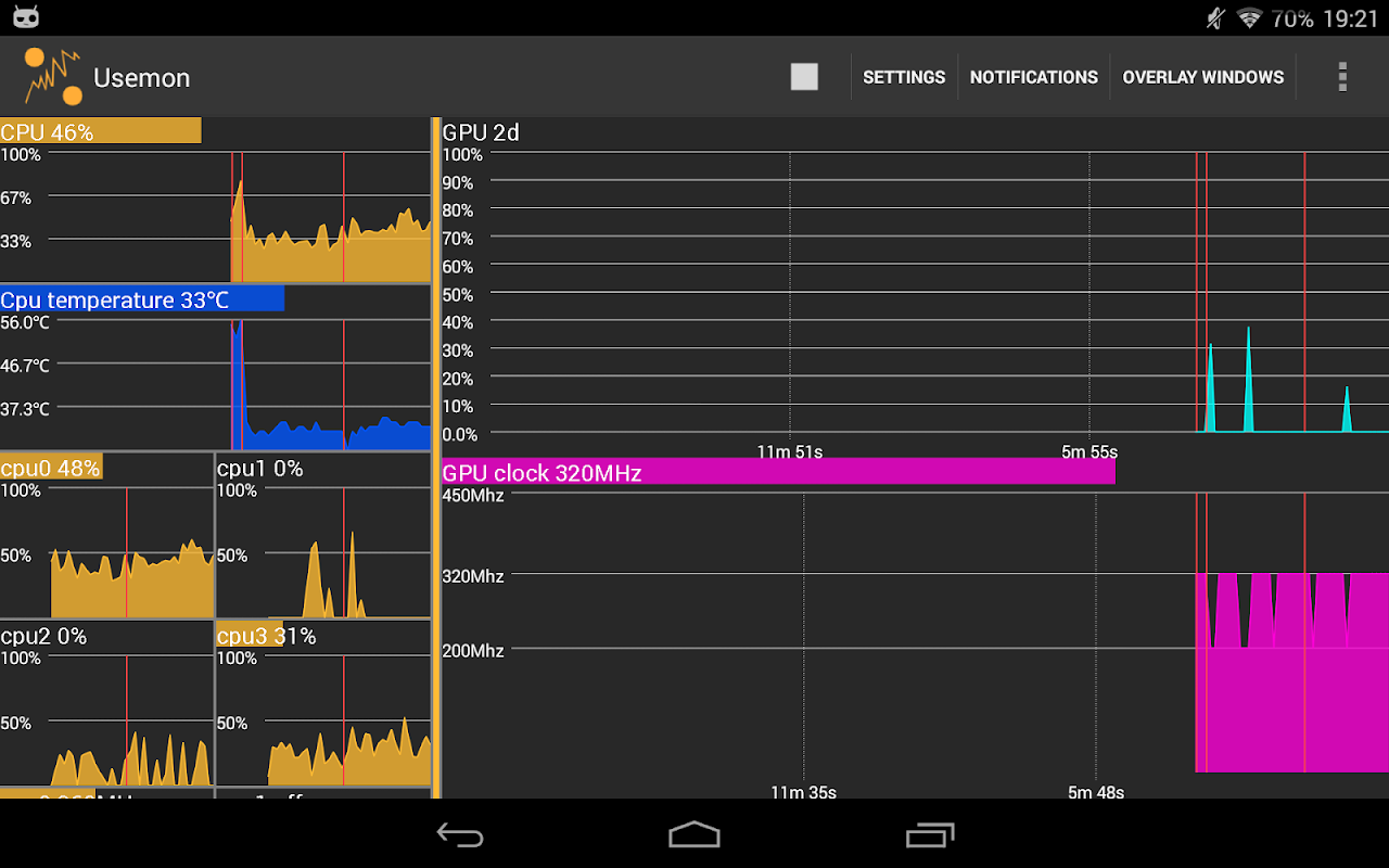 Usemon is a simple application for monitoring usage of system resources. It displays graphs of CPU, RAM, and network usage. (For dual and quad core devices per core stats are supported.) No root needed. It is extremely lightweight, because it gets these data directly from the kernel. It can show permanent statusbar notifications of these too (when enabled). It support devices running android 4.0 and higher, thanks to that it integrates well into the holo themed system. Only app on play which can monitor GPU usage and clock (adreno only).