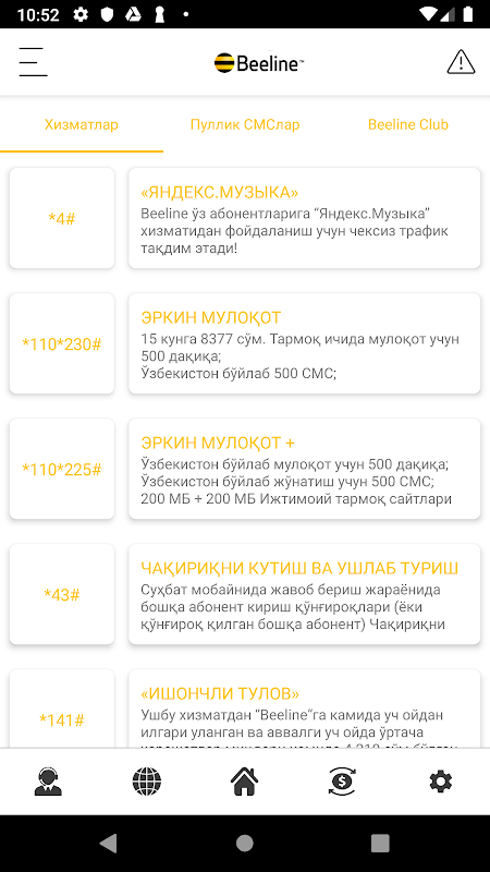 Instalując, otrzymasz odpowiedzi na wszystkie pytania i następujące możliwości od operatorów telefonii komórkowej z Uzbekistanu - UMS - UMS, Uzmobile - Uzmobayl, Ucell - Ucell, Beeline Beeline i Perfectum - Perfectum: