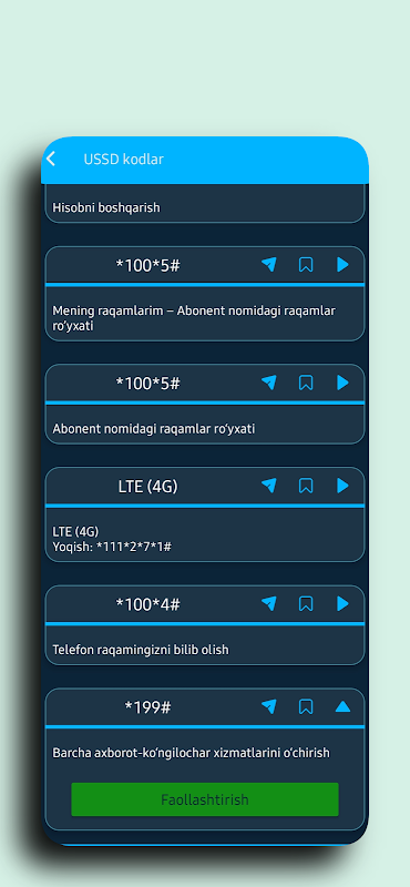 USSD Kodlar dasturni o'rnatganingizdan, czyli aloqa operatorlari