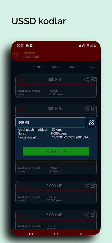 USSD Mobile dasturni o'rnatganingizdan so'ng aloqa operatorlari haqida barcha savollaringizga javoblar olasiz va quyidagi imkoniyatlarga ega bo'lasiz: