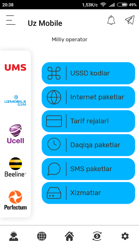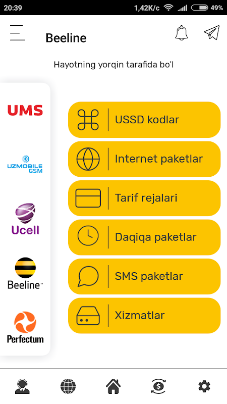 USSD Pro dasturni o'rnatganingizdan so O'ng O'zbekiston mobil aloqa operatorlari UMS Uzmobile Ucell Beeline va Perfectum haqida barcha savollaringizga javoblar olasiz va quyidagi imkoniyatlarga ega bo'lasiz: