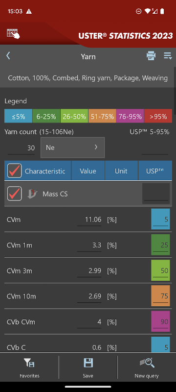 Unikalne dane porównawcze USTER® STATISTICS można wizualizować w różnych widokach, aby dopasować je do indywidualnych potrzeb. Użytkownicy mogą zdefiniować preferowaną serię instrumentów i cechy jakościowe, dzięki czemu nawigacja do wymaganych wyników jest jeszcze szybsza. Aby uzyskać szybki dostęp do często używanych wyników, można je zapisać w aplikacji jako „ulubione”.