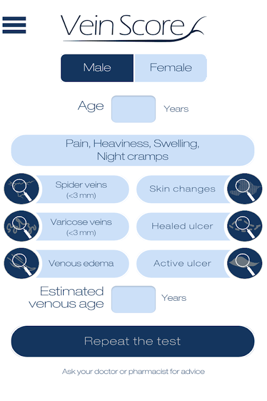 VeinScore is an easy-to-use application that allows you to estimate your venous age, which is directly related to venous disease, according to the presence of signs or symptoms of chronic venous disease.