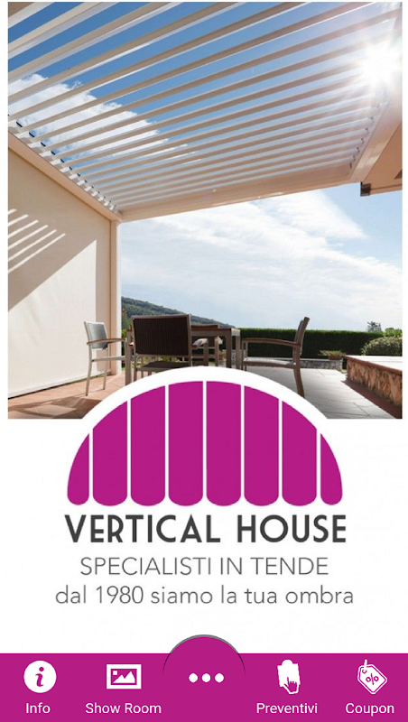 Pionowe Dom produkuje i sprzedaje markizy, moskitiery, duże opakowania, weneckie meble, panoramiczne okna, altan ogrodowych i więcej, utrzymując produkt oferuje na bieżąco dostarczać jakości rozwiązań do potrzeb rynkowych i clienti.La jakość wykonania, w połączeniu ze zdolnością do tworzenia zasłony i zawsze nowe struktury i nadaje się do każdego rodzaju potrzeb, pozwoliły Vertical House do szybko rośnie, z powodzeniem nakładające się na terytorium, na krótki czas. Rok po roku, to rzeczywistość nabrała nowych pracowników, których twórcy nauczyli i wykonane wysoce wyspecjalizowane. Stworzyliśmy naszą aplikację aby promować naszą markę i być bliżej naszych klientów. W rzeczywistości, dzięki powiadomieniom push możemy komunikować nasze promocje, nowe produkty i oferują cenne rady. W naszej aplikacji można zobaczyć nasze produkty, zażądać niestandardową ofertę, osiągnie lub zadzwonić do naszego biura za pomocą jednego kliknięcia. Mamy również zarezerwowany dla tych, którzy pobrać nasze app powitalny kupon rabatowy do wykorzystania przy pierwszym zakupie.