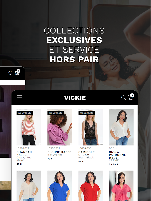Odkryj kolekcję Vickie i jej modowe niezbędniki dla kobiet. Noszenie odzieży z kolekcji Vickie zachęca lokalne talenty, ponieważ kolekcja została w całości zaprojektowana i wyprodukowana w Quebecu.