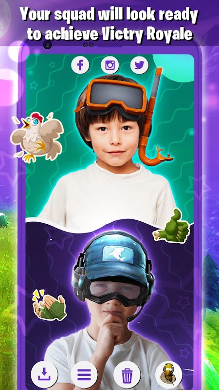 Po prostu bycie dobrym w grze fortnitów to za mało, fajniej jest, jeśli dobrze wyglądasz podczas kręcenia 🎯 i wygrywasz! Opublikuj swój zrzut ekranu ➊ Victory royale z Twoim wynikiem dzięki temu edytorowi ubierania i ludzie będą zaskoczeni zarówno umiejętnościami gry, jak i wyglądem dzięki tym wspaniałym naklejkom. Jeśli pokonałeś kogoś z headshot no scope 🔭, świętuj z tą aplikacją Victory Royale Edytor Zdjęć. Użyj go jako własnego twórcy skórek dla fort🔫nite. Pobierz i baw się dobrze!