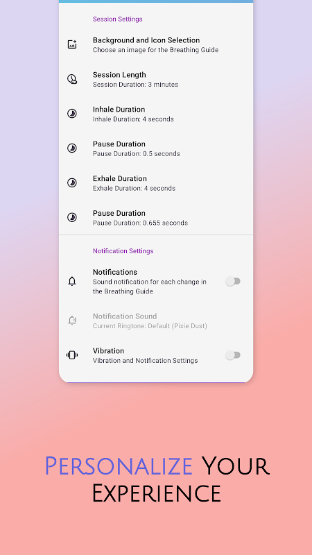 Spersonalizowany oddech z obrazami, dźwiękami i zaawansowaną kontrolą czasu.