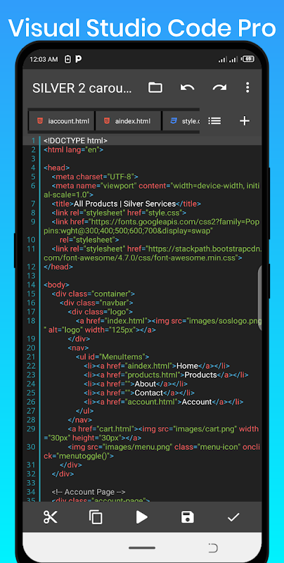 Visual Code Editor : Mobile websites Builder is an optimized text focused on coding. It is an handy tool for development on a Android. Quickly change code snippets, preview them, and maximize coding level even with our in-built JavaScript IDE.