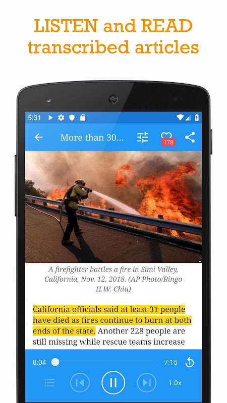 Ta aplikacja została zaprojektowana, aby zapewnić Ci jak najlepsze wrażenia, aby poprawić swój angielski. Możesz czytać, słuchać i oglądać lekcje wszędzie za pomocą urządzeń mobilnych. Nawet jeśli już znasz język angielski, możesz dowiedzieć się więcej o kulturze amerykańskiej, historii oraz najnowszych wiadomościach na świecie.