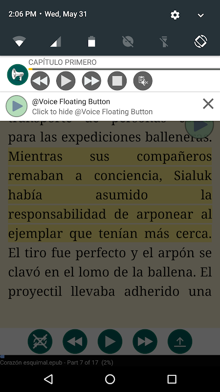 @Voice Pływające Przycisk Plugin nie jest samodzielna aplikacja. To jest do użytku z @Voice tylko Aloud Reader, zapewniając przycisk „pływający”, który pozostaje na wierzchu każdego innego ekranu, aż do osób niepełnosprawnych. Zapewnia funkcje play / pause, a po długim naciśnięciu pokazuje lub ukrywa dwie mniejsze boczne przyciski, które pozwalają przejść lub backup głośnego czytania przez zdań, albo po długim naciśnięciu - przejść do następnego lub poprzedniego artykułu na liście czytania. Łatwo przenieść w dowolne miejsce na ekranie lub ukryć / wyświetlić przycisk od zgłoszenia.