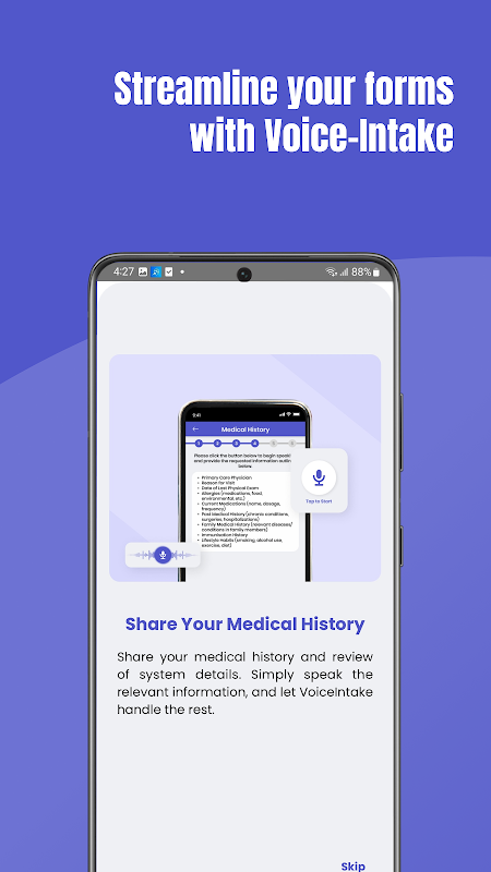 - Magia zamiany mowy na tekst: dzięki VoiceIntake po prostu mów i patrz, jak Twoje słowa przekształcają się w starannie wypełnione formularze. Nasza najnowocześniejsza technologia zamiany mowy na tekst sprawia, że cały proces jest dziecinnie prosty.