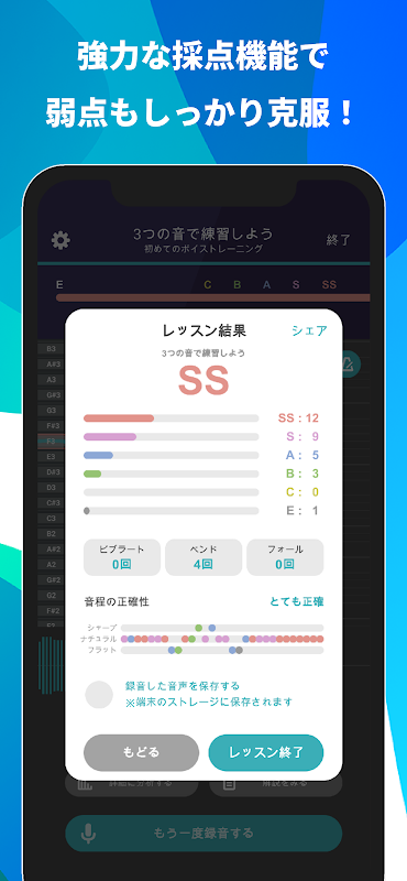 Lekcje posiadają funkcję punktacji, dzięki czemu możesz samodzielnie ocenić swój trening głosowy.