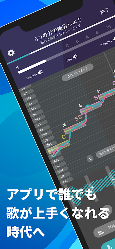 Śpiewające głosy są wizualizowane w czasie rzeczywistym za pomocą technologii analizy głosu. Możesz sprawdzić różnicę w dźwięku w centach.