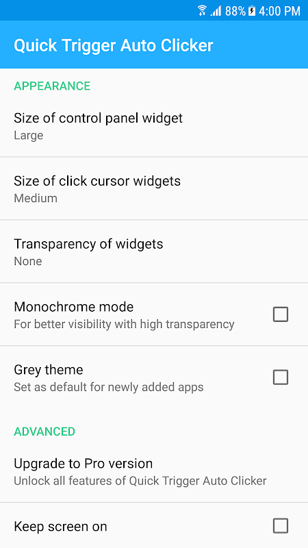 UWAGA: ze względu na ograniczenia w ramach ułatwień dostępu w Androidzie kliknięcie wywołane klawiszami głośności przerwie wykonywanie ręcznych gestów dotykowych. Oznacza to, że aplikacja nie działa w grach, w których musisz trzymać drugi palec na ekranie, aby poruszać się podczas uruchamiania akcji (jak w typowej strzelance).