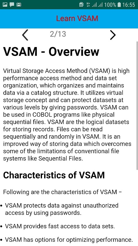 VSAM stands for Virtual Storage Access Method. VSAM is a file storage access method used in MVS, ZOS and OS/390 operating systems. It was introduced by IBM in 1970's. It is a high performance access method used to organize data in form of files in Mainframes. VSAM is used by COBOL and CICS in Mainframes to store and retrieve data. VSAM makes it easier for application programs to execute an input-output operation.