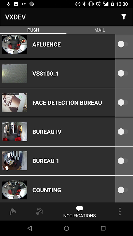 Nie trzeba wykupić subskrypcję SMS Alert serwera VXCore. Z powiadomień Push, użytkownik zostanie powiadomiony w czasie rzeczywistym alarm uruchamia się bezpośrednio na smartfonie. Kliknij powiadomienie, aby bezpośrednio uzyskać dostęp do aplikacji w celu sprawdzenia zdarzenia alarmowego. Interfejs konfiguracyjny pozwala na filtrowanie powiadomień i / lub e-mail alarmów Push Mail.