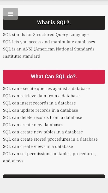 This App includes all topics related to SQL learn sql database for free.