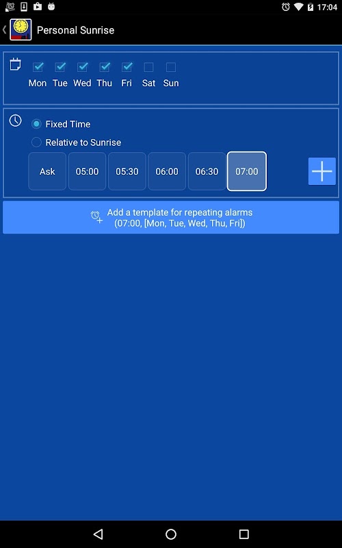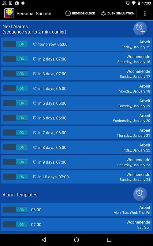 Wikipedia twierdzi, że „Symulacja świtu to technika pierwotnie opracowana, aby pomóc leczyć sezonowe zaburzenia afektywne, ale może być wykorzystana jako bezgłośny budzik, aby naturalnie obudzić ciało. Zazwyczaj leczenie polega na taktowaniu świateł w sypialni, aby stopniowo włączać okres od 30 minut do 2 godzin, przed przebudzeniem. ”. WakeLight oferuje kilka opcji konfiguracyjnych do symulacji światła (długość sekwencji, krzywa jasności, jasność min / max) i dźwięk (dźwięk alarmu, czas drzemki i dźwięk) w połączeniu z komfortem okresowych szablonów alarmów (z usuwaniem pojedynczego alarmu) i oczywiście czasy pojedynczego alarmu. Zobacz zdjęcia. Ta aplikacja jest bardzo przydatna podczas podróży: zabierz ze sobą symulację świtu!