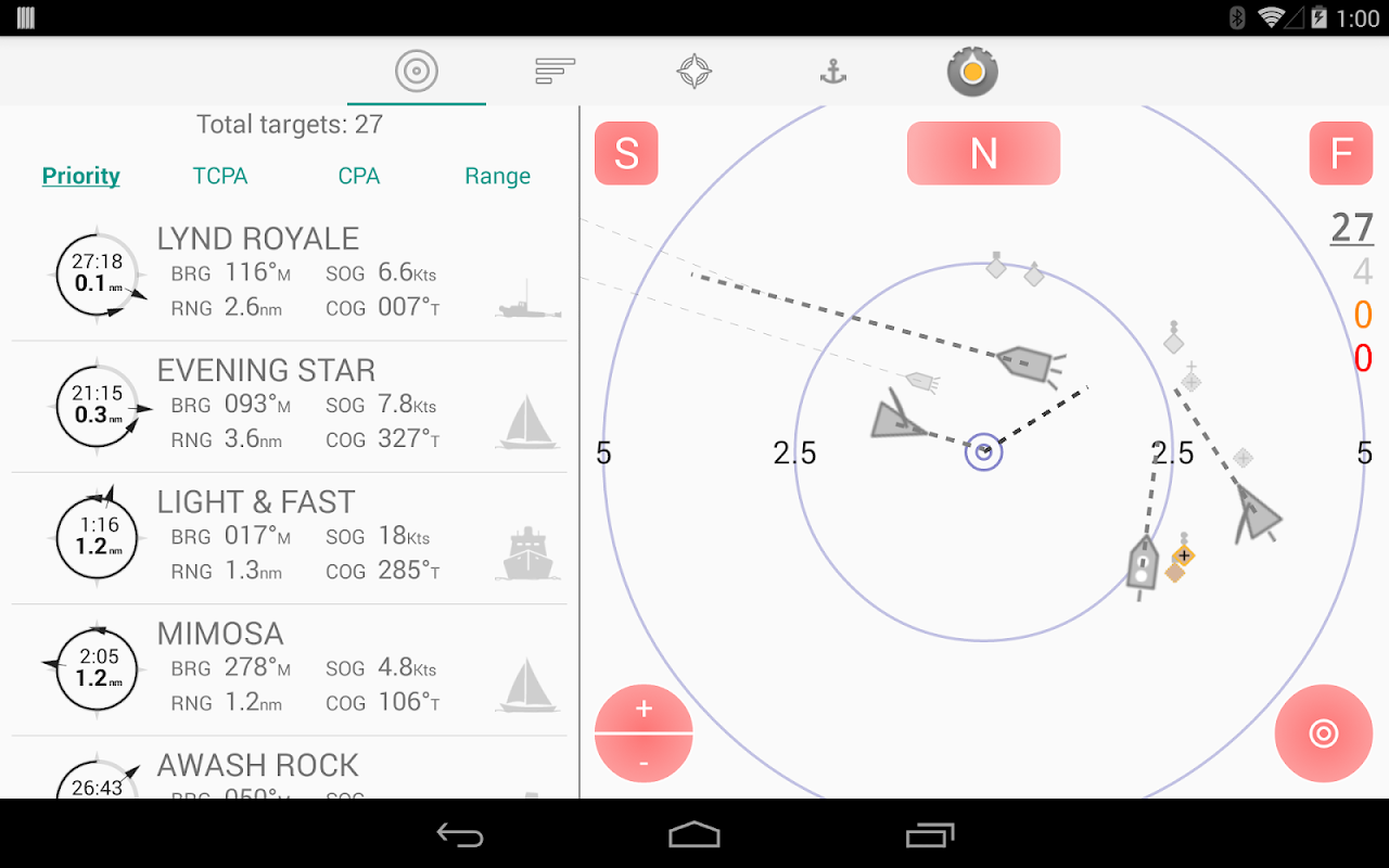 - Natychmiast pozyskuje szczegóły celu, w tym nazwy statków w pamięci podręcznej. Wyświetla cele AIS w widoku listy, umożliwiając sortowanie według priorytetu, CPA, TCPA i zasięgu.