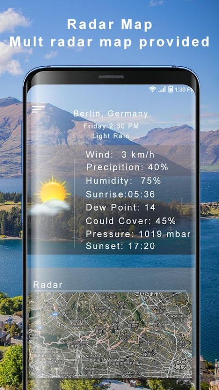 Prognoza pogody automatycznie wykrywa pogodę w Twojej bieżącej lokalizacji. Istnieje wiele informacji w prognozie pogody, które obejmują warunki pogodowe, ciśnienie atmosferyczne, wilgotność względną, odległość widoczności, opady w różnych jednostkach, punkt rosy, prędkość i kierunek wiatru, oprócz dziesięciodniowej prognozy na przyszłość, również godzinowej prognozy pogody.