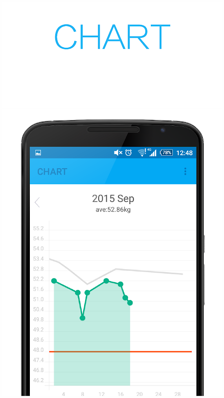 Możesz zobaczyć swoje postępy w stosunku do poprzedniego miesiąca w formie wykresu lub wyświetlić zysk lub utrata masy ciała w postaci listy, cały czas sprawdzając, ile masz w lewo, aby przejść aż trafisz swoje cele.