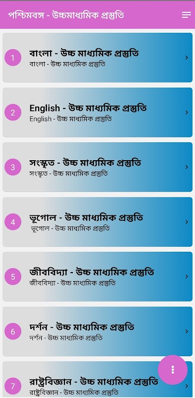 Ta aplikacja jest przeznaczona dla sugestii H.S. Bengalu Zachodniego 2025 - বাংলা, angielski, সংস্কৃত, ভূগোল, জীববিদ্যা, দর্শ ন, রাষ্ট্রবিজ্ঞান, শিক্ষাবিজ্ঞান, ইতিহাস, informatyka.