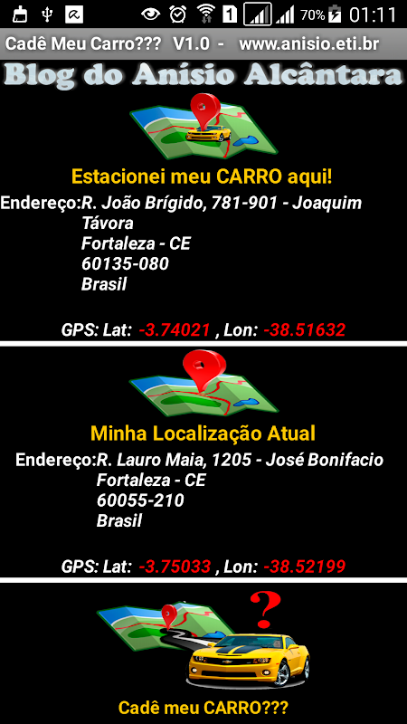Dzięki tej aplikacji, kliknij przycisk, gdy zaparkować samochód, a Android korzysta z czujnika położenia nagrywać współrzędne GPS wozu i adres. Później, po powrocie do samochodu, otworzyć aplikację, sprawdzić swoje bieżące położenie i kliknij ikonę gdzie moja bryka? I pokazuje mapę, gdzie jesteś na miejscu w samochodzie. Problem rozwiązany !!! wystarczy postępować zgodnie z instrukcjami, aby zlokalizować sue samochodu.