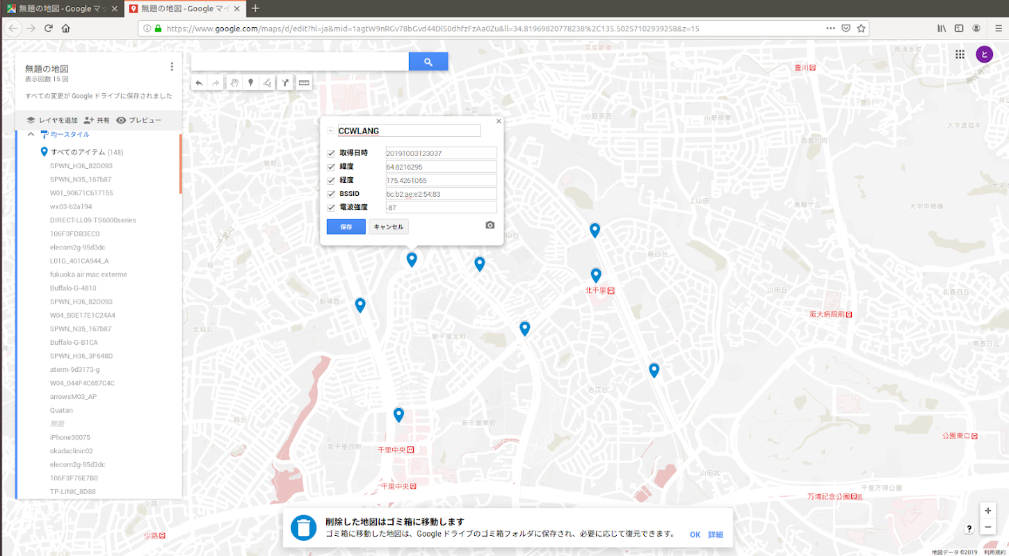 出力したデータをGoogleMapなどで読み込むことで、自分が収集したWiFi位置情報をMap上におとすことができます。