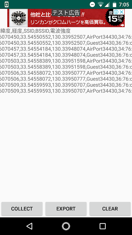 収集する情報は、緯度、経度、SSID、BSSID電波強度、取得日時です。