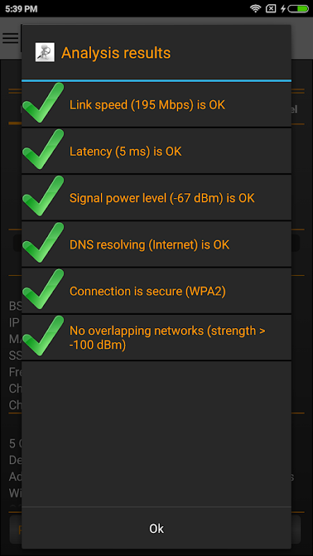 * Szczegółowe informacje na temat sieci i punktu dostępu, w tym dostawcy punktu dostępu, częstotliwości, szerokości kanału, poziomu bezpieczeństwa i informacji DHCP, BSSID (adres MAC routera).
