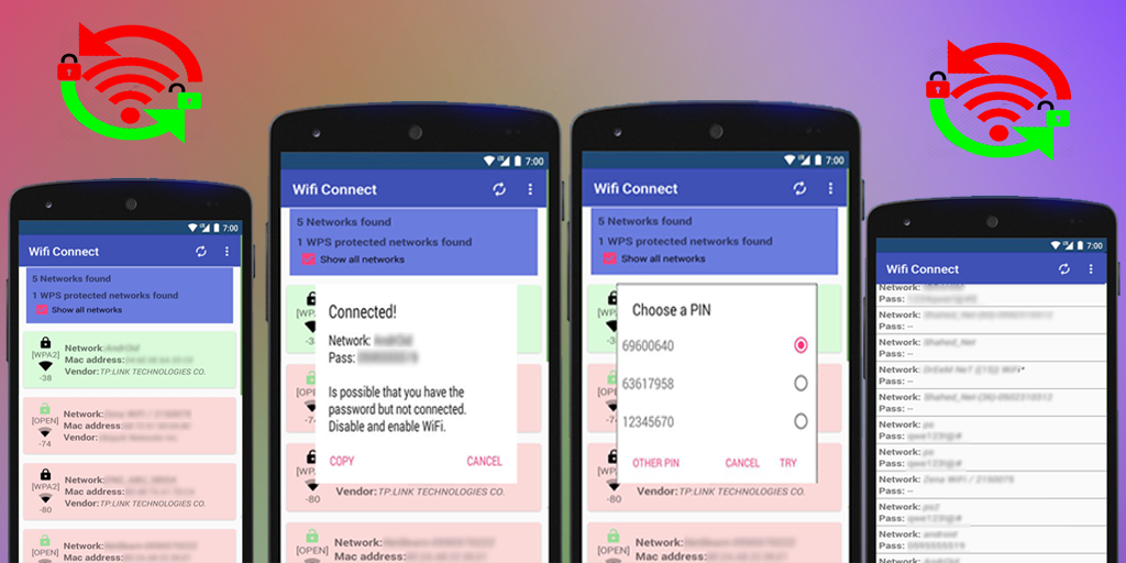 For pin connection you need to be ROOT user in less than Android 5.0 (Lollipop) versions. The advantage of being ROOT is that you can show network password if the pin connection is successful we will, otherwise you will connect to the network but cannot show it. Each feature will be enabled or disabled depending on the situation of each terminal.