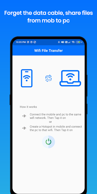 Wifi File Transfer umożliwia przesyłanie plików, takich jak muzyka, zdjęcia, filmy, dokumenty, dowolny typ plików z urządzenia z systemem Android na komputer za pośrednictwem sieci Wi-Fi. Nie potrzebujesz internetu, po prostu połącz się z tą samą siecią Wi-Fi, co na komputerze lub włącz hotspot w telefonie komórkowym i podłącz komputer do tego Wi-Fi. Wystarczy, że możesz udostępniać pliki całkowicie w trybie offline.