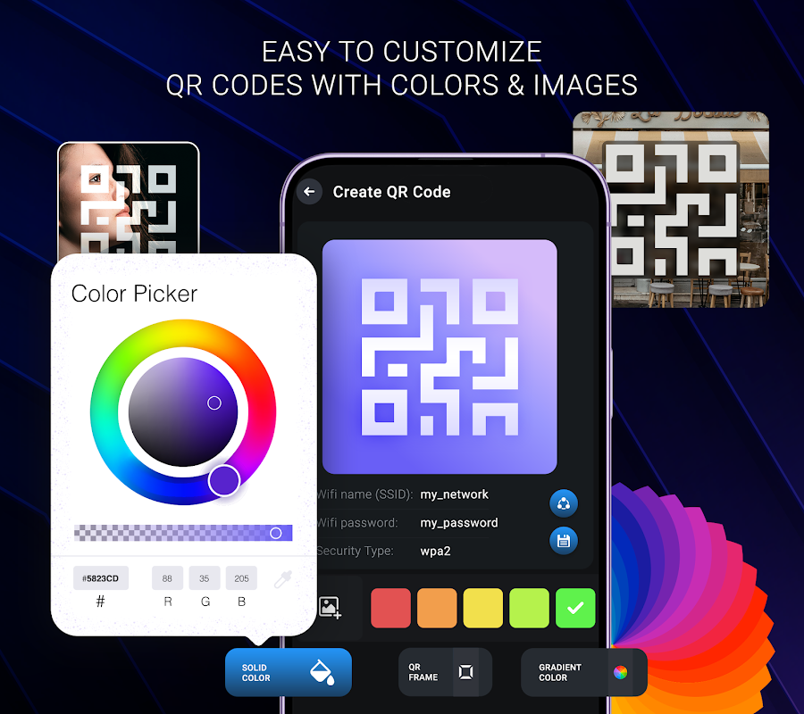 - Natychmiastowe generowanie kodów QR: Twórz spersonalizowane kody QR dla swojej sieci Wi-Fi w ciągu kilku sekund. Wprowadź dane swojej sieci, a nasza aplikacja wygeneruje unikalny kod QR gotowy do udostępnienia.