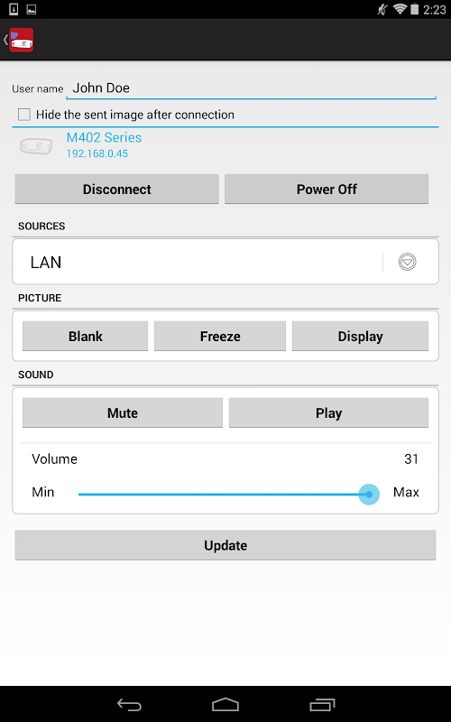 Można kontrolować podłączony projektor. Przełączanie sygnału wejściowego, Picture-Mute sound-Mute itp są dostępne.