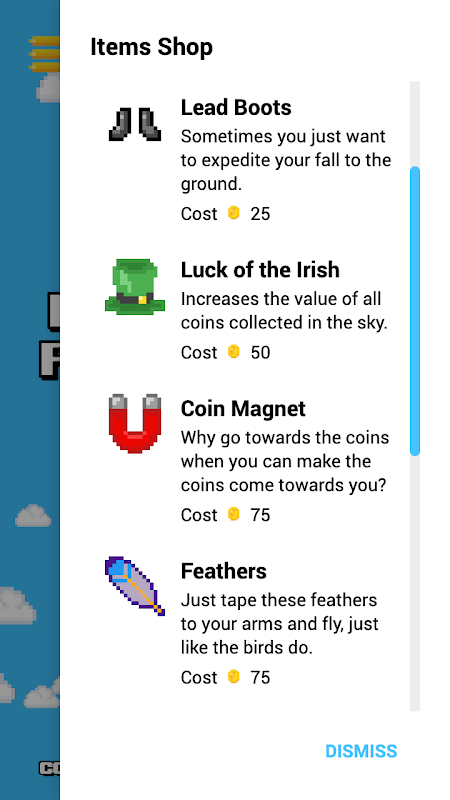 W Without a Parachute musisz machać swoimi „skrzydłami” (ramionami) tak szybko, jak to możliwe, aby spróbować opóźnić nieuniknione. Po drodze możesz zbierać monety, które pomogą ci kupić niesamowite power-upy, które jeszcze bardziej zwiększą twoje szanse na sławę i chwałę w przestworzach. Co dziwne, sklep z przedmiotami nie sprzedaje prawdziwego spadochronu...