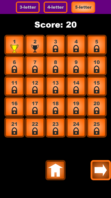 - Complete a mind-boggling set of 240 levels across 3 categories (3, 4 and 5-letter sets).