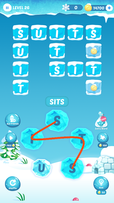 Dostajesz więcej niż tylko słowo w Word Frozen - relaksująca i przyjemna muzyka w tle, grafika HD z przyciągającymi wzrok elementami, eleganckie kolory pasujące do motywu, animacja wizualna ... wszystko po to, by było to dzieło sztuki. Podczas gry będziesz poruszał się po naszej mapie poziomu, tak jak robisz przygodę na lodowej krainie wróżek.