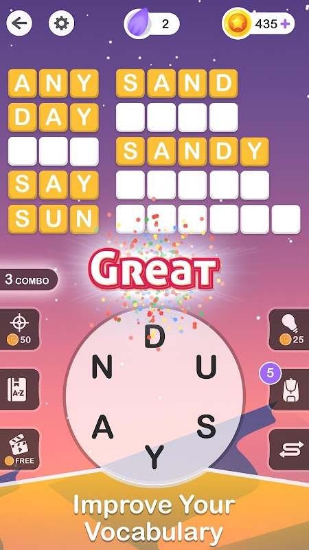 - Znajdź jak najwięcej słów, aby odblokować poziomy i zdobyć dodatkowe monety bonusowe.