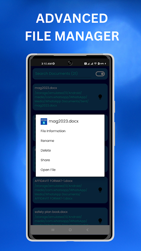 8. Zachowaj porządek dzięki aktualizowanym informacjom o plikach Word docx dzięki menedżerowi dokumentów, który wyświetla informacje, zmienia nazwę docx, usuwa dokumenty, udostępnia dokument, ma edytor docx dla nazwy pliku słownego, umożliwiając łatwe otwieranie dokumentów biurowych Word.