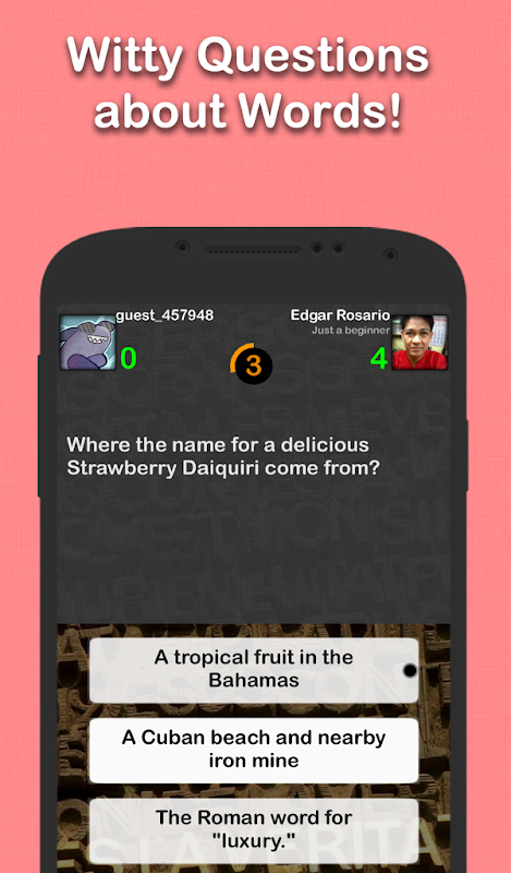 Zabawy słowem klimatów z przyjaciółmi! To słowo ciekawostki gry pozwala na odtwarzanie słowa live wobec ludzi z całego świata, lub ze znajomymi.