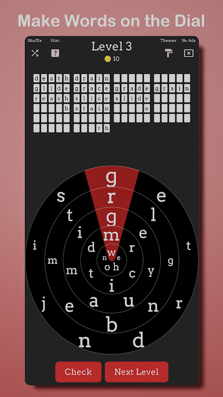 Obracaj pokrętłem, aby tworzyć słowa! Twórz słowa, aby przejść na nowe poziomy lub zdobywaj monety, których możesz użyć do stworzenia motywu tarczy!
