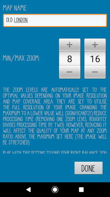 So we created World Mapper, where you are free to navigate any map image, in FULL resolution with no size limit (obviously, your storage space is the limit). The app contains a wizard that allows you to import map files and they will then be processed to fit Google Maps as overlays.