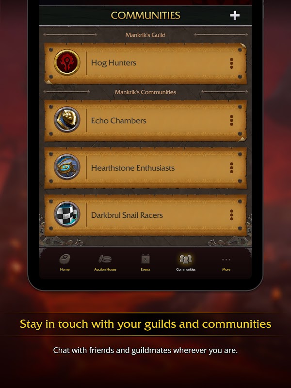 BĄDŹ W KONTAKCIE: Rozmawiaj ze znajomymi w grze za pośrednictwem funkcji Gildii i Społeczności, śledź najnowsze nagłówki i artykuły z World of Warcraft w panelu Wiadomości oraz planuj najazdy i wydarzenia w Kalendarzu.